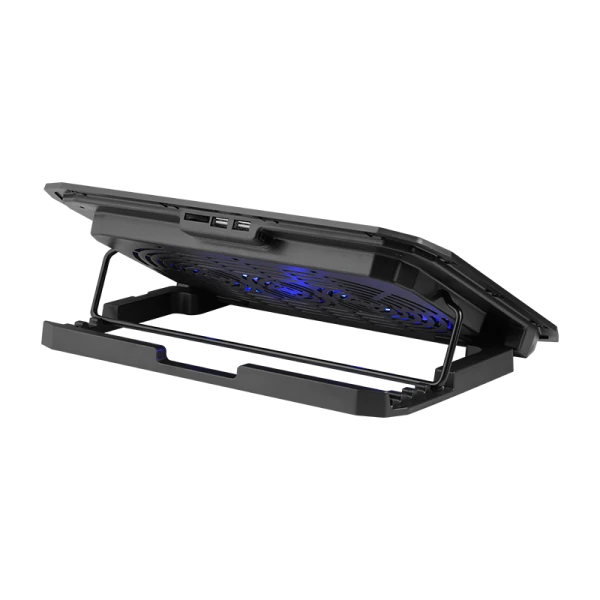 Низкий уровень шума позволяет использовать подставку в ночное время. Подсветка подставки позволяет работать без дополнительных источников освещения в темное время суток. Регулировка угла наклона подставки даёт возможность выбрать несколько положений подставки для максимального комфорта в игре или работе. Резиновые накладки предотвращают скольжение по поверхности стола. 2 встроенных USB-порта - один из разъемов можно использовать для питания подставки, второй - как удлинитель USB для подключения мыши.