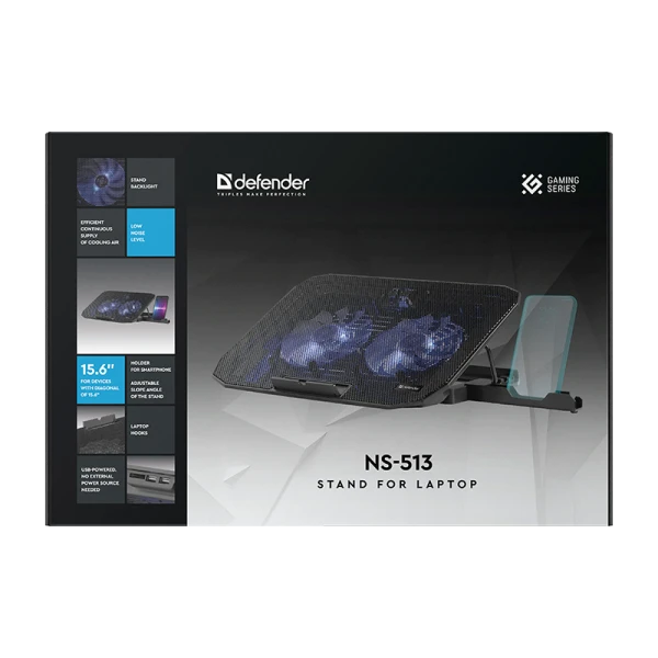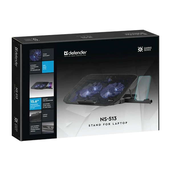 Компактная охлаждающая подставка Defender NS-513 с двумя мощными вентиляторами и регулируемым углом наклона для максимального комфорта при работе с ноутбуком. Фиксаторы для ноутбука обеспечат устойчивое положение техники на подставке.