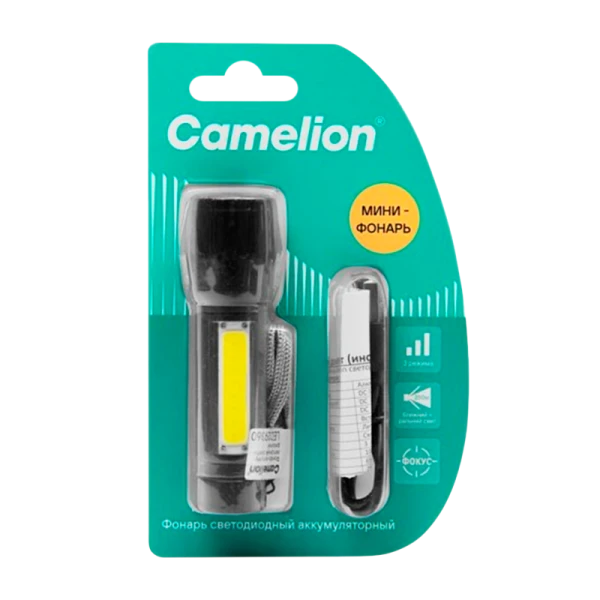 Фонарь ручной светодиодный аккумуляторный Camelion LED29360 миниатюрный от аккумулятора, черного цвета, с 2 светодиодами - дальнего и ближнего света, фокусировкой и 3 режимами освещения.