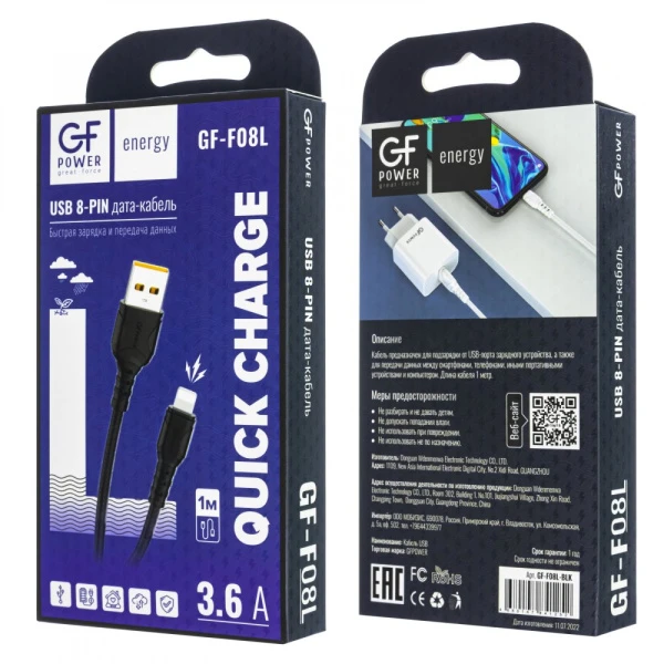 Кабель GFPower F08L USB (m)-Lightning (m) 1.0м 3.6A ПВХ черный.