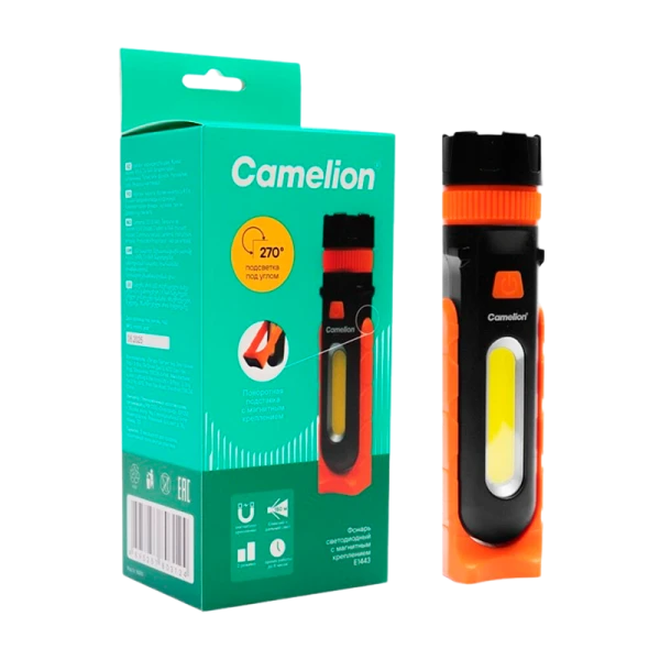 Фонарь Сamelion E1443 отлично подходит для проведения осмотровой работы. 2 светодиода: с фокусирующим рефлектором - для дальнего освещения, COB - для ближнего света. 2 режима работы. Поворотная подставка с встроенным магнитом для крепления к металлу.