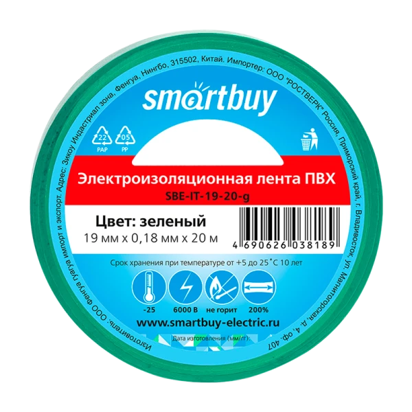 Изолента Smartbuy 19мм*20м ПВХ зеленый