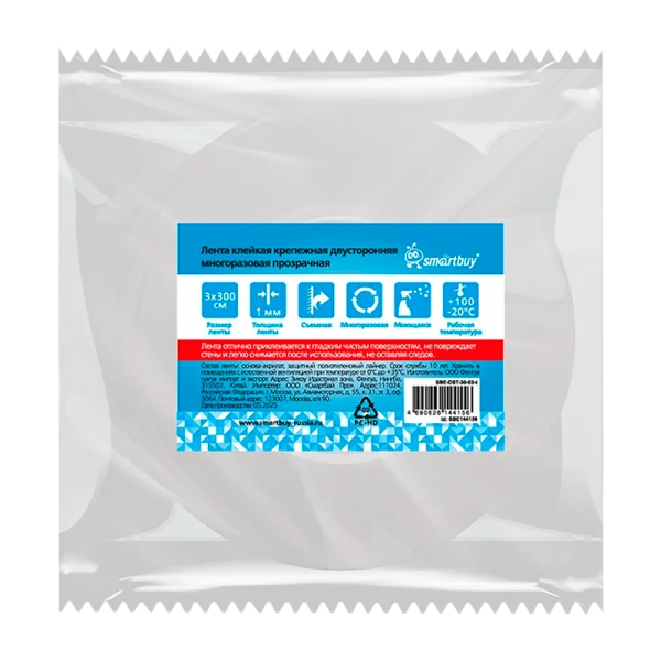 Скотч Smartbuy 30мм*3м двусторонний многоразовый прозрачный.