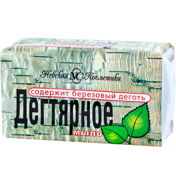 Дегтярное мыло Невская Косметика содержит около 10% берёзового дёгтя. Оно является эффективным средством от прыщей, себореи, угревой сыпи, нейродермита, псориаза, экземы и других кожных заболеваний. Дёготь обладает противовоспалительными и антисептическими свойствами. В сочетании с мылом он может усилить приток крови к тканям кожи и ускорить регенерацию тканей эпидермиса, которые были повреждены. Березовый дёготь подсушивает ранки на коже, ускоряя процесс их излечения. Дегтярное мыло имеет резкий запах дёгтя, напоминает запах горелой бересты. Хорошо заживляет кожу от микротравм и опрелостей. Дегтярное мыло широко используется людьми с сильной пигментацией. Не содержит искусственных красителей и обладает естественным темным цветом.