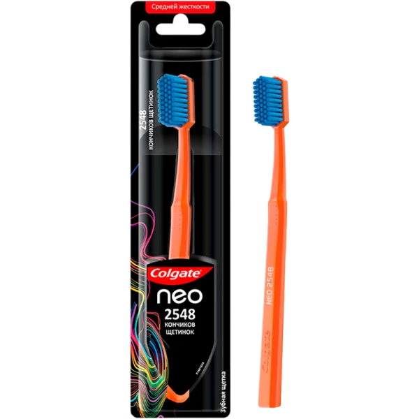 Стильная и обладающая непревзойденными функциональными преимуществами зубная щетка COLGATE NEO с щетиной средней жесткости превращает чистку зубов в легкий процесс. Она бережно относится к зубам и деснам и эффективно очищает полость рта, обеспечивая приятное ощущение чистоты. Щетинки с высокой плотностью предназначены для бережной чистки зубов и удаления пятен на эмали. 2548 кончиков щетинок средней жесткости.