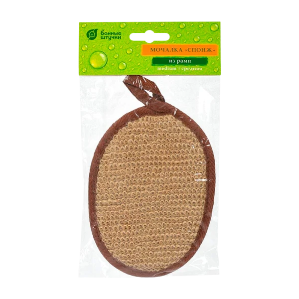 Мочалка из рами (китайская крапива) Банные штучки, не жесткая. Прекрасно подходит для массажа. Является самой бережной, так как она мягко отшелушивает кожу, а не обдирает ее. Еще одним достоинством мочалки из рами является её гипоаллергенность. Подходит для ежедневного применения. Для использования в бане, сауне и дома. Материал: рами, хлопок, поролон, терилен;