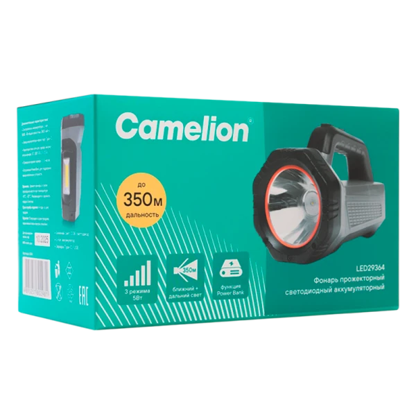 Лучевой фонарь-прожектор Camelion с большой дистанцией освещения - свыше 350 м, кемпинговый плафон и встроенный PowerBank. Полезен охранникам, обходчикам, рыбнадзору и представителям других профессий, где требуется освещение дальних объектов.