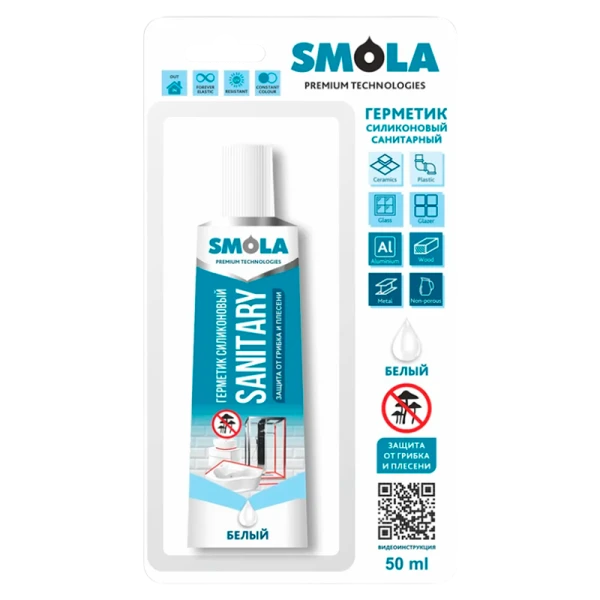 Герметик силиконовый SMOLA Sanitary санитарный белый - это состав со 100% содержанием силикона для герметизации швов в санитарных помещениях. Не меняет цвет и не чернеет в течение всего срока эксплуатации. Предназначен для работ в санитарных помещениях – уплотнения швов в ванной, душевых кабинах, раковинах, унитазах, дренаже, ПВХ-труб, водоснабжении.