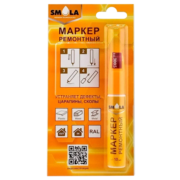 Маркер ремонтный SMOLA RAL 3005 винно-красный предназначен для устранения, ремонта и ретуширования дефектов, царапин, сколов на различных поверхностях методом нанесения быстросохнущей цветной эмали, стойкой к воздействию влаги.