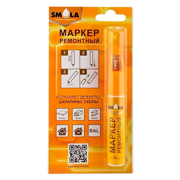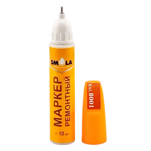 Маркер ремонтный SMOLA RAL 8001 золотой дуб предназначен для устранения, ремонта и ретуширования дефектов, царапин, сколов на различных поверхностях методом нанесения быстросохнущей цветной эмали, стойкой к воздействию влаги.