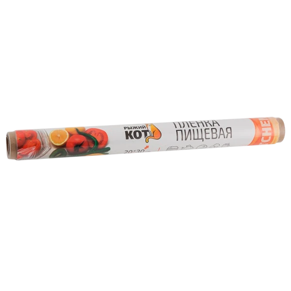 Пищевая пленка Рыжий кот, 20м х 30см, в ПВХ упаковке используется для упаковки различных пищевых продуктов. Благодаря эффекту прилипания сохраняет свежесть продуктов, предотвращает от высыхания и защищает от посторонних запахов. Обладает отличной герметичностью и высокой сохранностью вкусовых качеств еды.