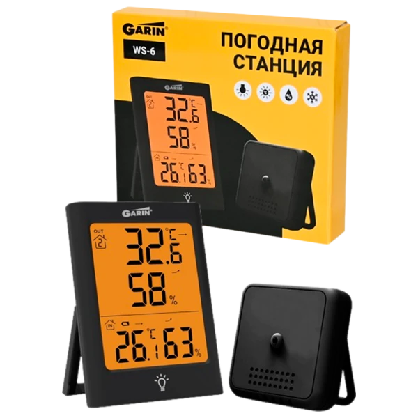 GARIN WS-6 - это профессиональная погодная станция для мониторинга микроклимата в двух зонах. Основной блок измеряет температуру и влажность в помещении, а беспроводной датчик передает данные с улицы, балкона или другой комнаты на частоте 433 МГц. Контрастный дисплей с яркой подсветкой отображает показания даже в темноте.