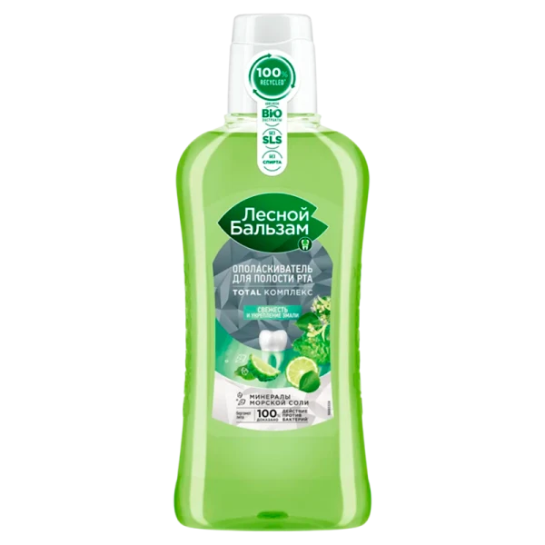 Ополаскиватель для рта Лесной Бальзам Бергамот и липа Total Комплекс - это эффективное средство для гигиены ротовой полости, укрепления эмали зубов и устранения неприятного запаха. Ополаскиватель для полости рта борется с бактериями 24/7. Лесной Бальзам обеспечивает приятное ощущение чистоты и свежести.