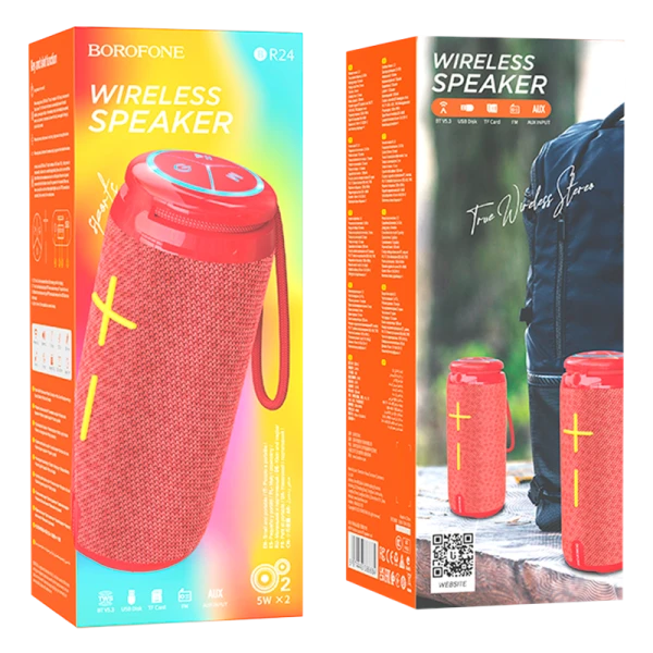 BOROFONE BR24 Fashion – яркая и стильная портативная колонка с множеством режимов работы и отличным качеством звука. Объемное и громкое звучание обеспечивают 2 динамика диаметром 45 мм и общей мощностью 10 W. Подключается к источнику звука по стабильному беспроводному соединению через Bluetooth 5.3 или с помощью аудиокабеля через разъем AUX. Поддерживает воспроизведение с карт памяти micro SD (TF), флешек USB. Есть встроенное FM-радио. Поддерживает функцию TWS, позволяющую подключить 2 колонки к источнику звука для более объемного звучания. На корпусе размещены кнопки управления воспроизведением и громкостью. Контактные разъемы закрыты герметичной резиновой заглушкой. Аккумулятор емкостью 1200 mAh рассчитан на 2 часа работы в режиме воспроизведения музыки. Время зарядки – около 1,5 часов.