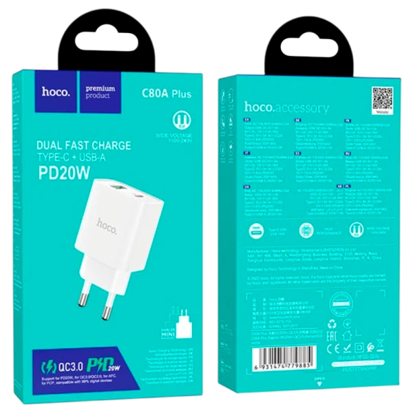 Сетевое зарядное устройство HOCO C80A оснащено выходами USB мощностью 18W и Type-C мощностью 20W. Поддерживает протоколы быстрой зарядки PD20W, QC3.0/QC2.0, PPS, AFC и другие. Подходит для зарядки смартфонов и других мобильных устройств. Блок для зарядки имеет защиту от замыкания и оснащен интеллектуальной системой идентификации, которая распознает заряжаемое устройство и выдает подходящие для него параметры зарядки. Корпус изготовлен из огнестойкого поликарбоната. Размеры – 78х43х27 мм, вес – 44 гр.