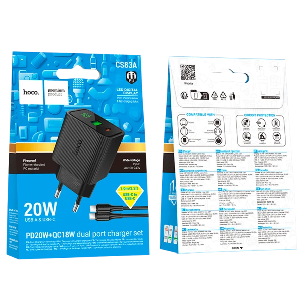 Сетевое З/У HOCO CS83A 1USB+1Type-C 3.0A 20W PD,QC дисплей с кабелем Type-C черный (1/18/180)