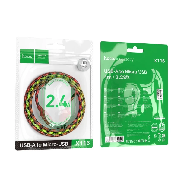 Кабель HOCO X116 USB (m)-microUSB (m) 1м 2.4A нейлон красный (1/68/680)