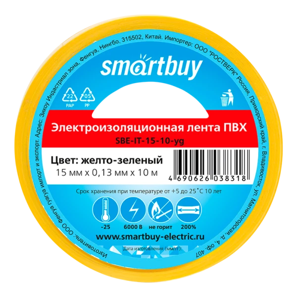 Изолента Smartbuy 15мм*10м ПВХ желтый зеленый