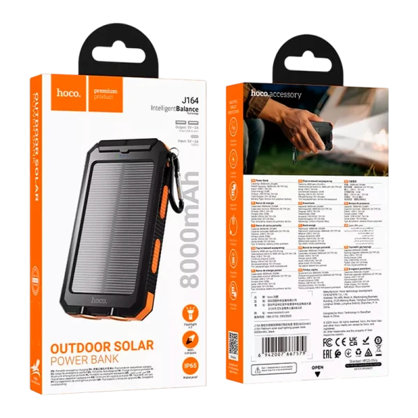 Внешний аккумулятор HOCO J164 8000mAh 2USB+Type-C солнечная батарея с фонариком черный