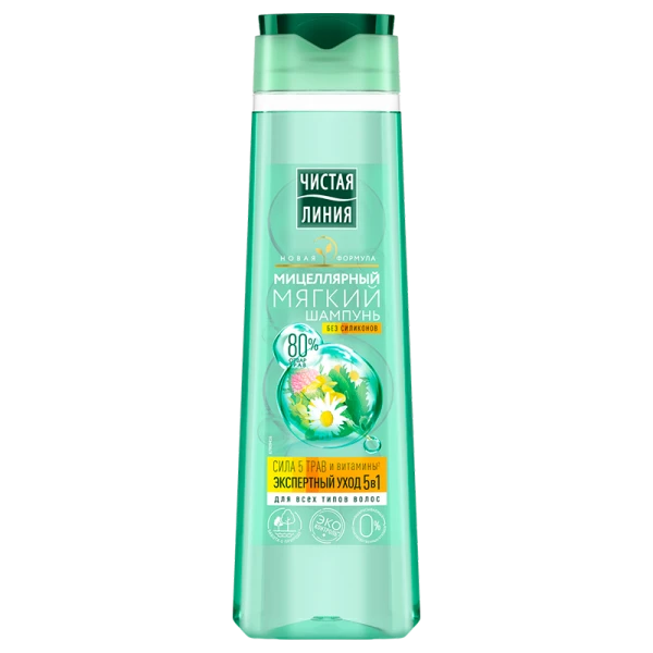 Шампунь Чистая линия Мицеллярный для всех типов волос «Экспертный уход 5в1 Сила 5 трав» не раздражает чувствительную кожу головы, сохраняет ее гидролипидный баланс и не пересушивает волосы даже при ежедневном мытье. Мицеллярная основа шампуня Чистая Линия бережно очищает и увлажняет волосы и кожу головы.
