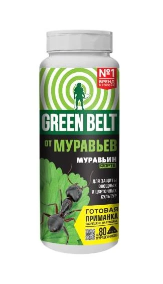 «Муравьин Форте Green Belt» — это готовая к применению отравленная приманка для уничтожения садовых муравьёв в частных подсобных хозяйствах. Действующее вещество препарата — имидаклоприд. «Муравьин Форте» выпускается в виде порошка и поставляется в пластиковых бутылках по 250 грамм. Продолжительность действия внутри муравейника составляет 3 недели и более. Применение: открыть упаковку, отмерить нужное количество порошка согласно инструкции, внести средство в места скопления муравьёв или нанести на грядки после высадки рассады. Для обработки муравейника верхний слой (около 5 см) вскрывается и посыпается инсектицидом, затем муравейник снова засыпается землёй. На упаковке указана информация о химическом составе и мерах предосторожности использования препарата.