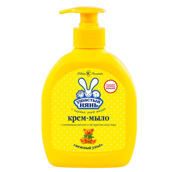 Жидкое крем-мыло для детей Ушастый нянь с оливковым маслом и экстрактом алоэ деликатно и бережно очищает нежную кожу малыша, может использоваться как для мытья ручек, так и для купания.