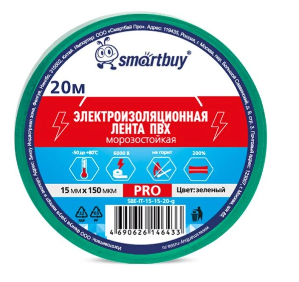 Изолента Smartbuy PRO 15мм*20м ПВХ морозостойкая зеленый